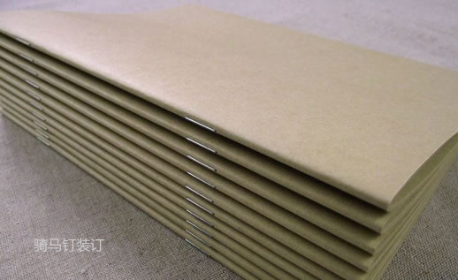 1.騎馬訂裝:將書冊(cè)套貼配頁,書脊打訂書釘,三面裁切成冊(cè)